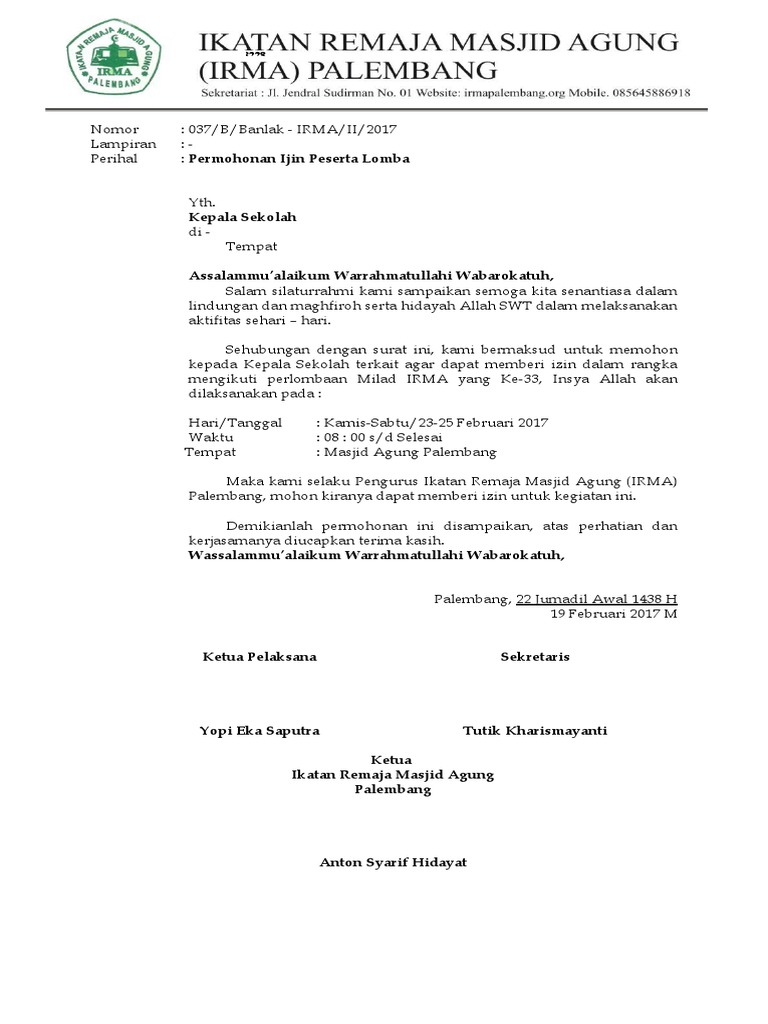 Hormat saya, (nama penanggung jawab) quipperian, itulah beberapa contoh surat izin sekolah yang bisa digunakan orang tua atau walimu untuk meminta izin pada guru. Sayangnya mahasiswa jaman sekarang kadang menggap enteng masalah absensi perkuliahan. Hormat kami, kepala sekolah sma negeri 1 medan, anton syahputra, m. Surat permohonan ijin peyelenggaran kegiatan merupakan sebuah surat yang diperlukan untuk memulai suatu acara yang akan diadakan di suatu tempat. The collection that consisting of chosen picture and the best amongst others.