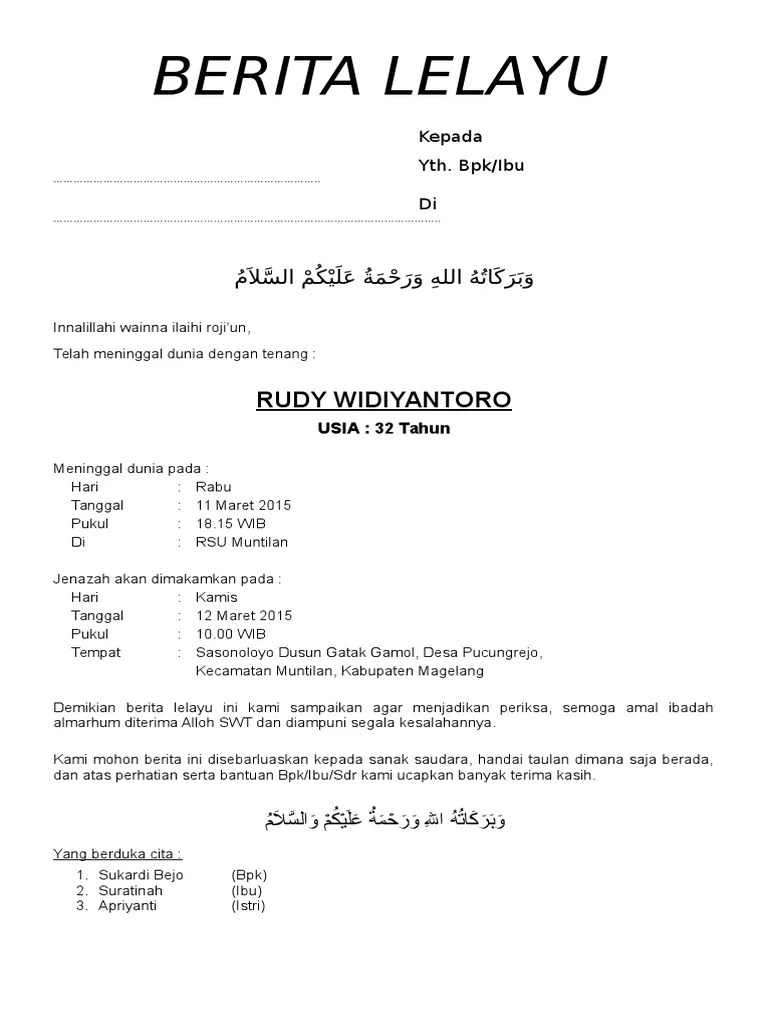Perilaku pencarian informasi masyarakat dusun sengir studi. Di setiap masjid atau mushola sekitar akan dikirimi surat berita lelayu/kematian almarhum/almarhumah berikut adalah contoh surat berita . Lelayu bakungan, 1 januari 2015. Download contoh format berita kematian / lelayu bahasa indonesia dalam format doc / docx / ms word dan pdf. Telah meninggal dunia dan berpulang kerumah bapa di syurga dengan tenang :